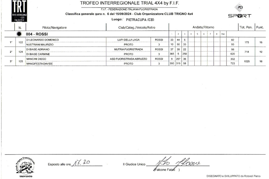 I vincitori sono stati: Categoria Verdi: Natalizia Manuel e Nafra Simone (Club Cinghiali 4x4); Blu: Bontempo Fabio e Masucci Matteo (Club Cinghiali Extreme); Categoria Bianchi: Dell’Uomo Gabriele e Tagliaferri Francesco (Club Cinghiali 4x4); Categoria Rossi: Di Leonardo Domenico e Nustriani Maurizio (Club Lupi della Laga). Nuovi iscritti: D’Ovidio Giuseppe e Florio Valerio (Club Trigno Fuoristrada), Marano Antonello e Di Marco Luca, Pozzuto Mario e Pettini Maurizio (Club Molise Fuoristrada).