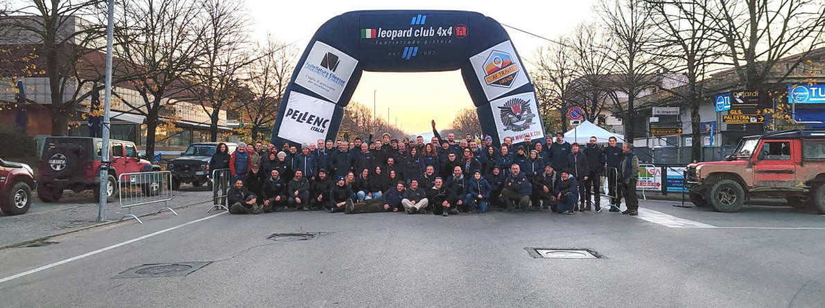 Lo staff del Leopard 4x4 riunito sotto l’arco ufficiale per la partenza del raduno.
