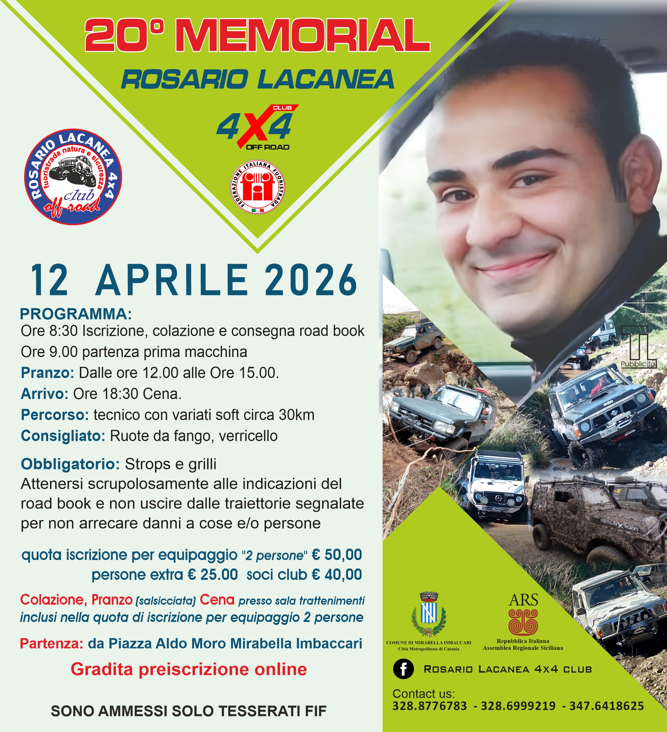 Il Club Rosario Lacanea 4x4 è lieto di invitarvi a partecipare al 20° Memorial in programma per domenica 12 aprile 2026 . percorso di circa 35km perlopiù tutto fuoristrada. percorso misto: fango, pietraie e passaggi tecnici.