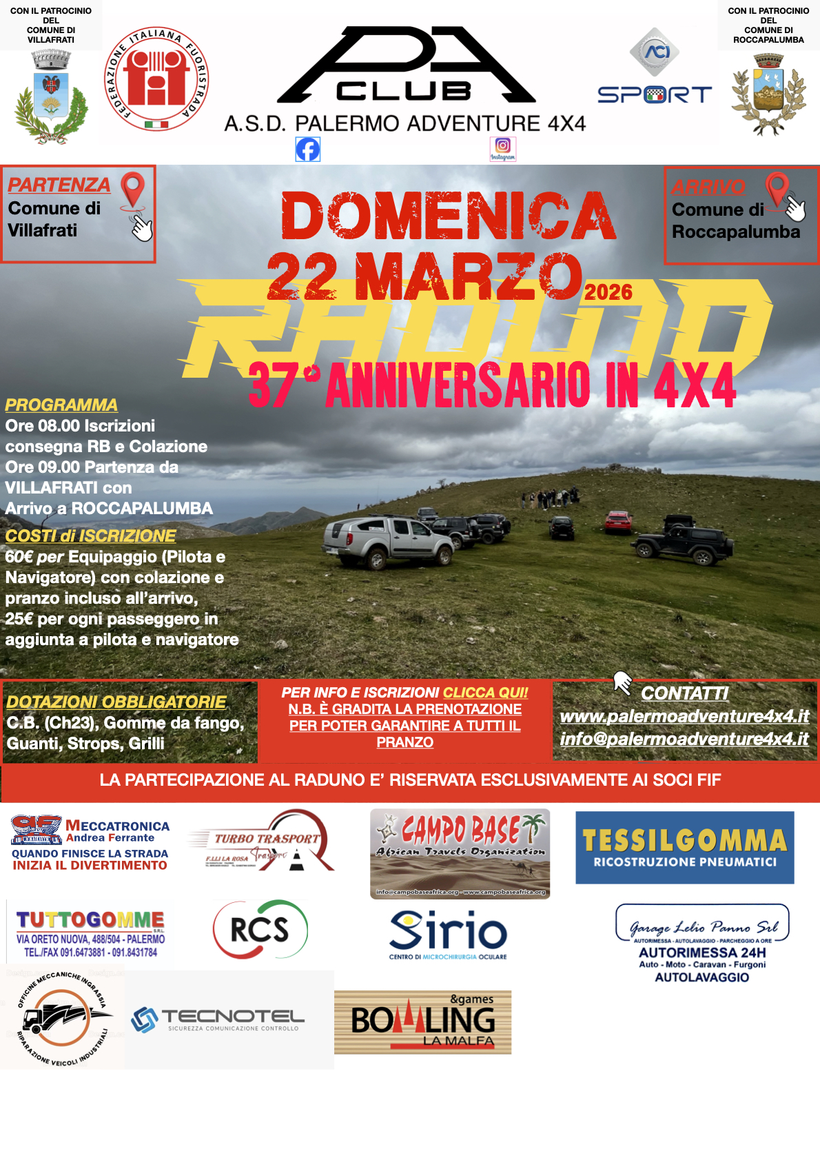 PALERMO ADVENTURE 4X4 vi invita a partecipare al 37° Raduno in programma per domenica 22 Marzo 2026 ed attraverserá i seguenti comuni: Villafrati, Vicari, Ciminna, Ventimiglia, sino ad arrivare a Roccapalumba, dove si concluderà l’evento.